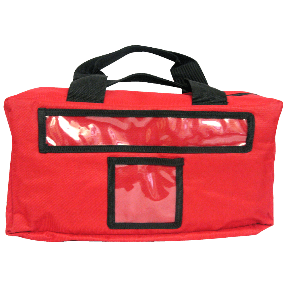A large sized compact first aid bag with 5 clear insert pouches externally with sturdy carry handles and a waist strap. Inside there are multiple pocket, mesh pockets, clear pouches, Velcro loops and a fold out insert. Also available in blue (BB001) or green with screen-printed signage (GB005).