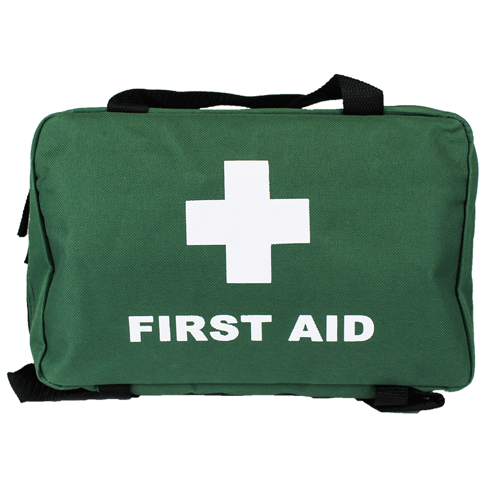 A popular medium Green softpack first aid bag with external printing, carry handles, zippered mesh pockets and elastic straps.