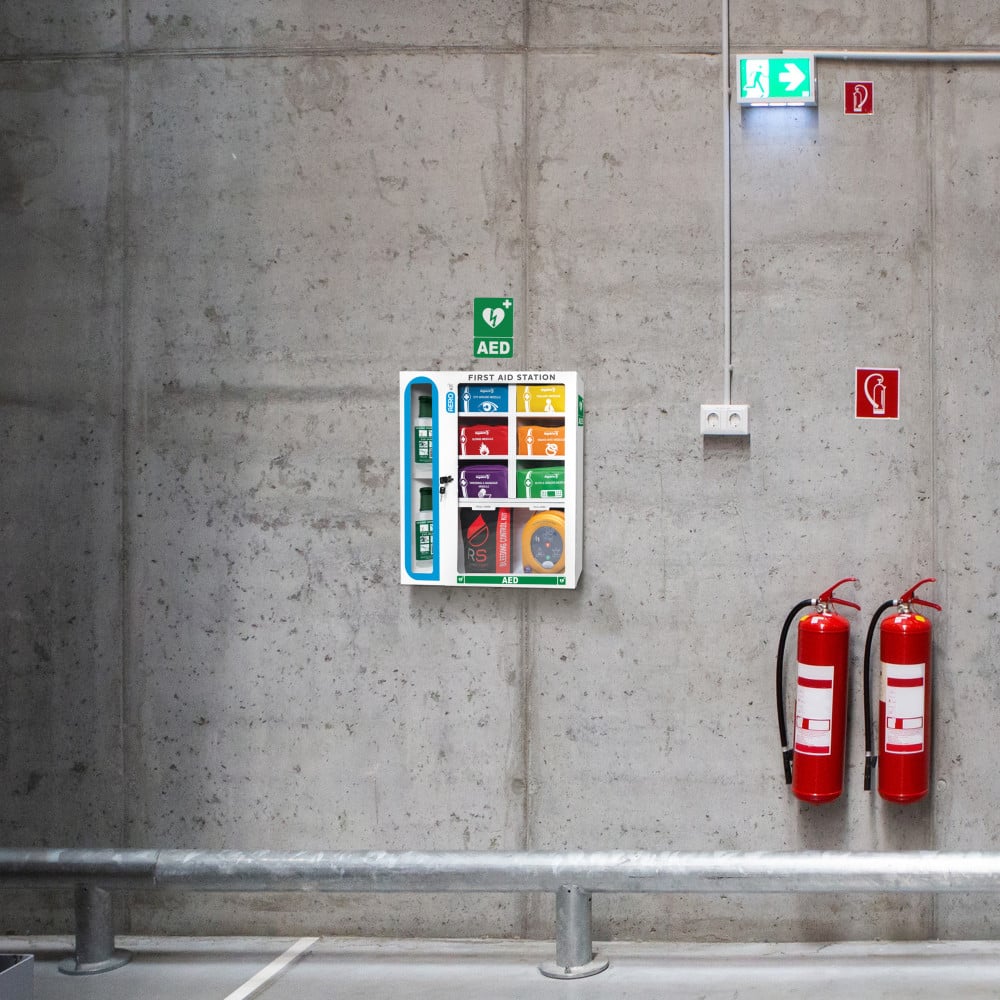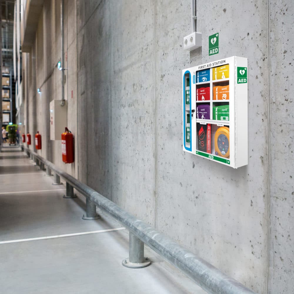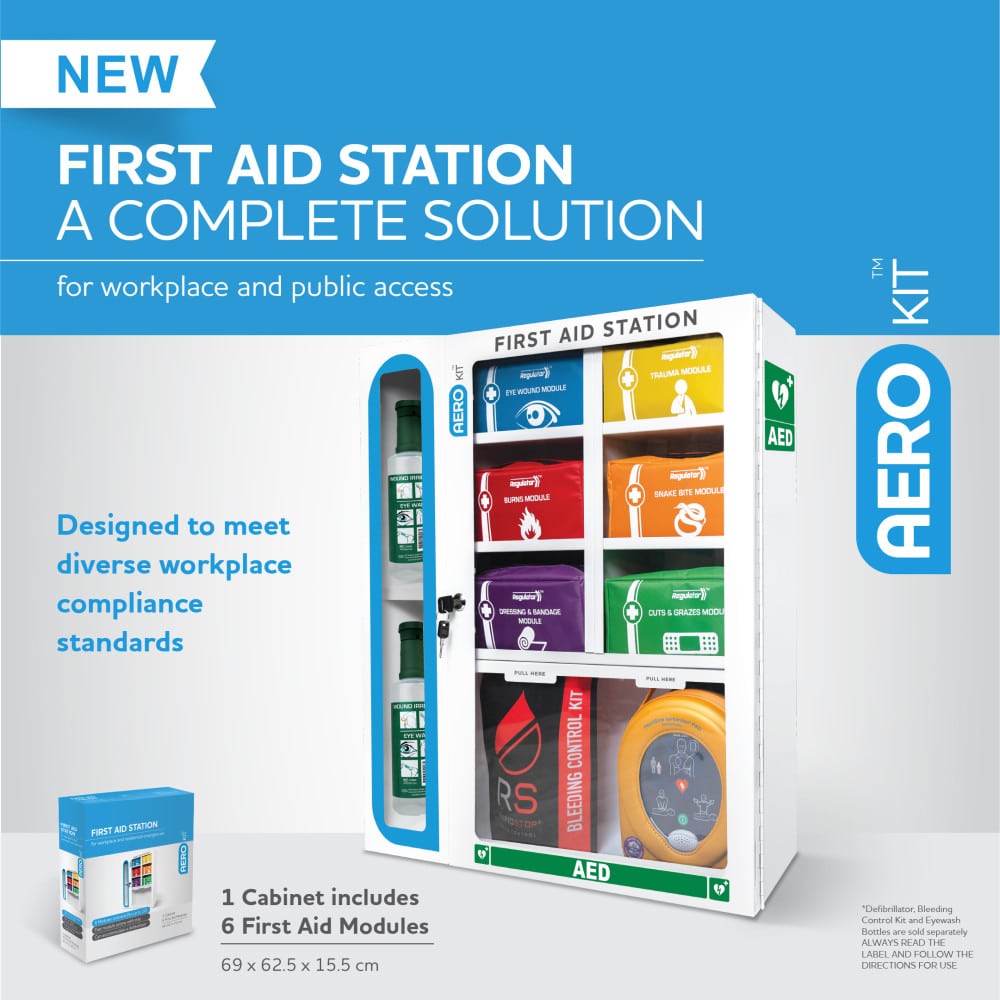 Ready for everything from minor cuts and abrasions to eye injuries, trauma, burns, and snake bites. Going beyond basic first aid, this station also supports extra safety measures with space for eye wash bottles, defibrillators, and bleed control kits. The Aero First Aid Station is a comprehensive workplace safety solution with versatility for a range of situations.