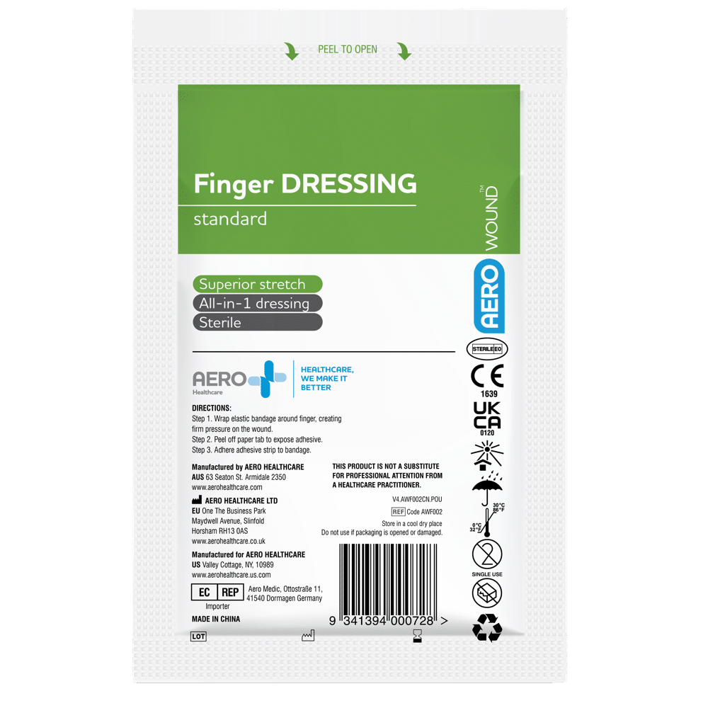 - The AEROWOUND Finger dressing is unique in the industry for it ability to treat finger wounds too large to cover with an adhesive dressing. This unique product combines a 4.5cm square low adherent and absorbent pad, with a wrapping leader and secure adhesive tab to protect the wound.