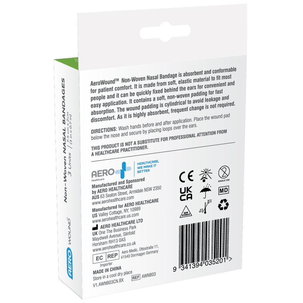 AeroWoundâ„¢ PostOperative Nasal Bandages are made of soft and elastic material that fits most people, with a convenient and easy application behind the ears. It contains a soft, non-woven padding for fast absorption with a cylindrical shape to avoid leakage and discomfort.