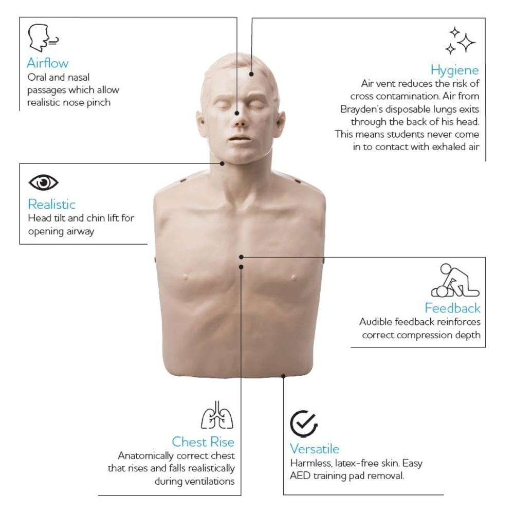 The Brayden CPR Manikin lets your students see the real point of CPR getting blood flowing to the brain and other organs with LED lights that illuminate the blood flow from the heart to the brain during CPR. The lights can be switched on or off as required.