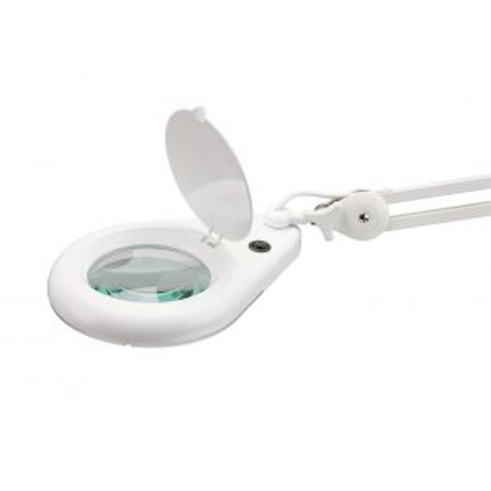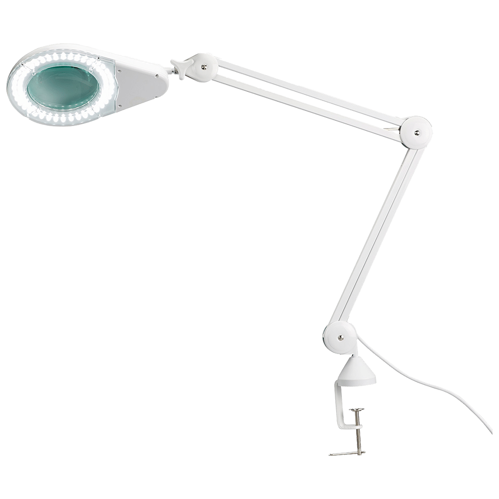 The AeroSupplies LED Magnifying Lamp comes with a table clamp and has a 1200mm reach/extension. It has lens 6 diopter magnification (2.5x) and is has 10 watt LED lights (6000K).