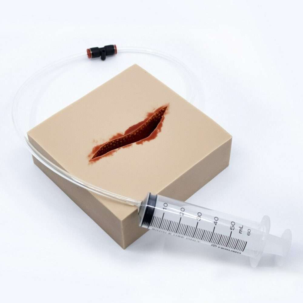 Task trainers allow students to train repeatedly in wound packing and haemostatic dressing techniques via a sturdy, realistic silicone base with tubing for bleeding capability. This is a Laceration Wound with the blood source controlled via a syringe. It is low-cost but critical training aid for any professional delivering life saving first aid training.